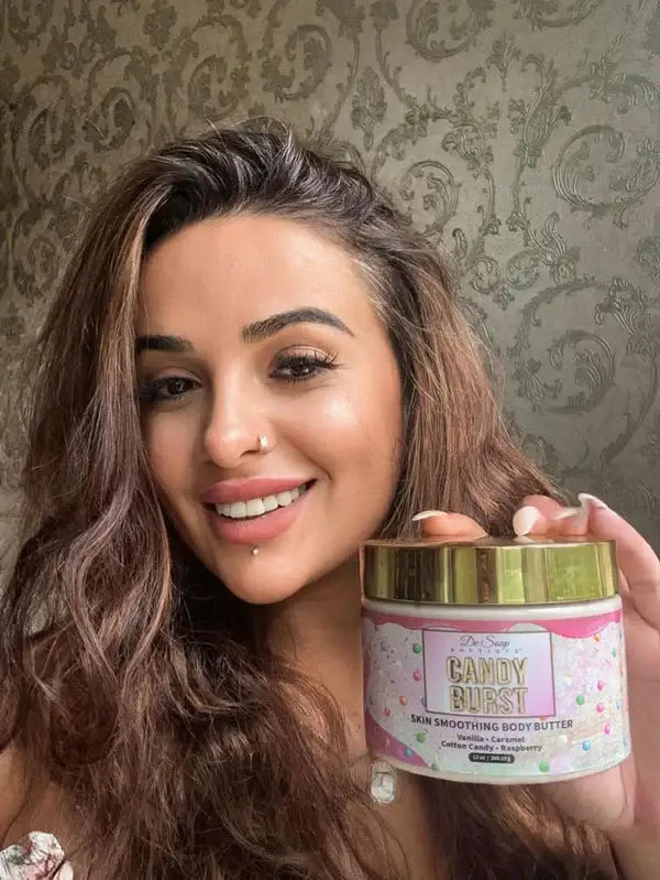 Our Candy Burst Skin Smoothing Body Butter combines hints of exotic Vanilla, Caramel, Cotton Candy, and Raspberry. Hyaluronic Acid, Coconut oil, and Shea butter work together to deeply penetrate the skin and supply hydration to the areas that need it most. Formulated to leave your body feeling heavenly-soft and satiny-smooth, with no greasy residue.